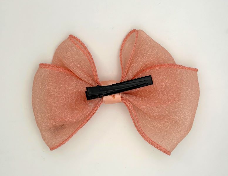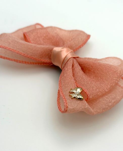 透明感のある生地を使用したピンクのヘアピンに、右下にあしらわれた金のリボンがポイント。