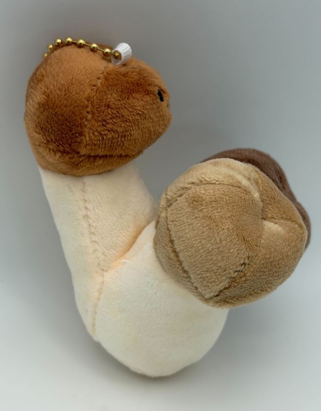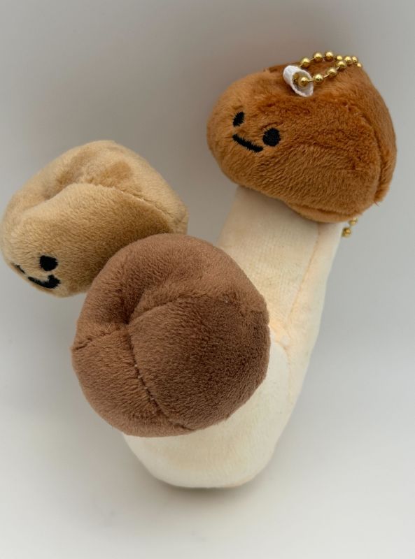 きのこをモチーフにしたユニークで可愛らしいぬいぐるみマスコットです。キノコのかさの部分には控えめで可愛らしい表情が刺繍されており、見ているだけでほっこりした気持ちになれます。バッグやポーチに付けるのにぴったりです。